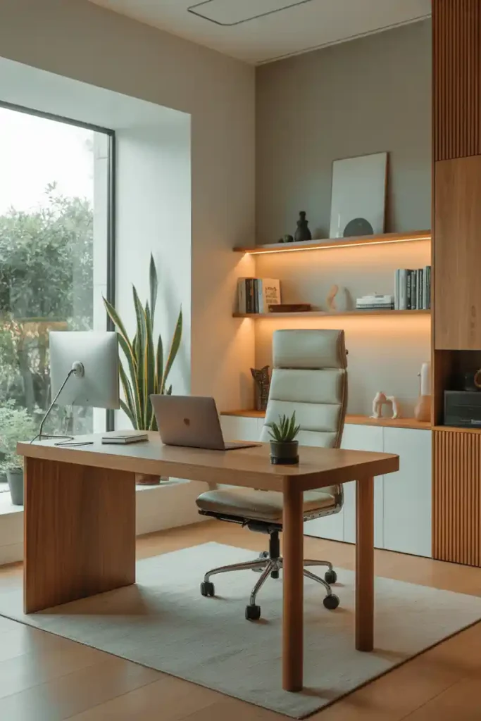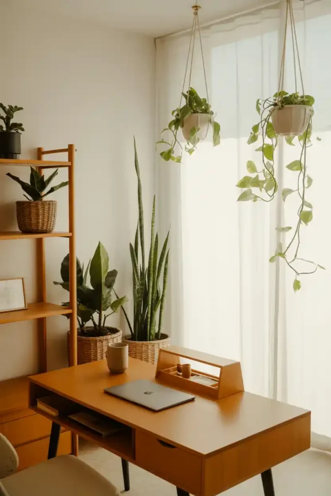 Blend minimalism with natural elements for a timeless look. Use warm wood tones for the desk, shelves, and accessories. Keep plants simple — a few tall floor plants or trailing vines.