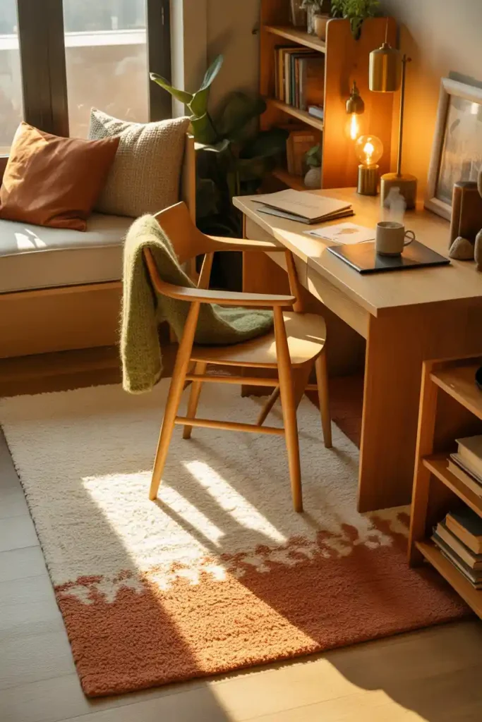 Start by placing a soft, thick area rug under the desk and chair. The texture underfoot makes a surprising difference, especially in cooler months.