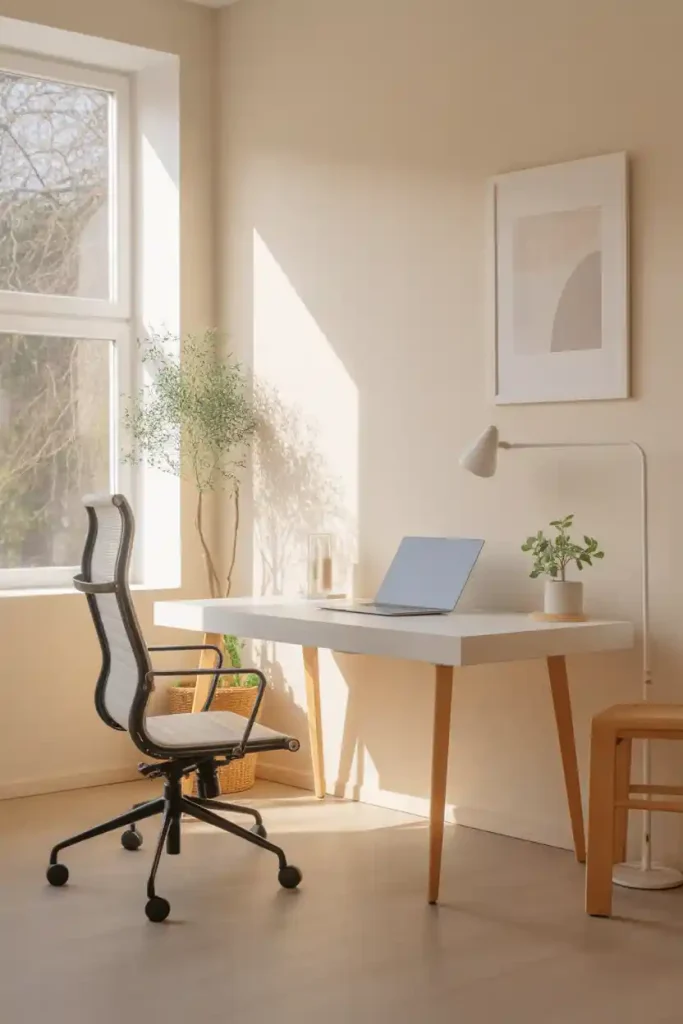 Begin with the basics: a straightforward desk in white, pale gray, or light natural wood. Pair it with a single comfortable chair that supports your posture without extra frills.