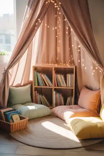 Turn a corner into the perfect book spot. Pile soft cushions, add a low shelf of favorite stories, and hang a canopy or string lights overhead.