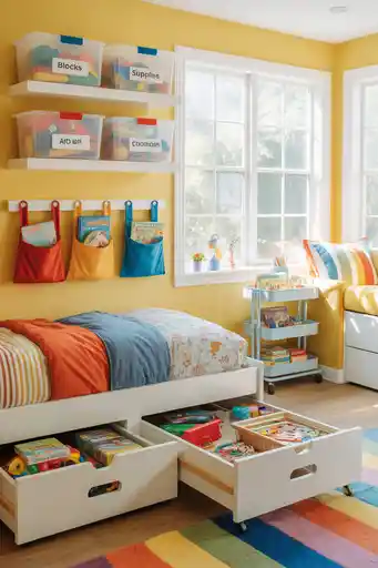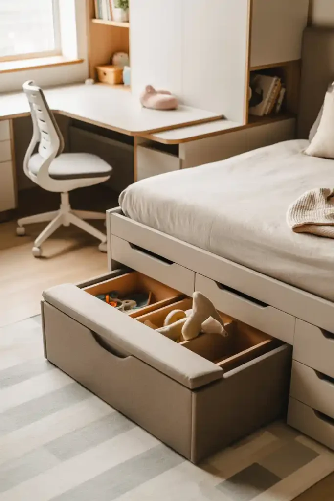 Clear labeled bins, under-bed drawers, and wall pockets keep toys in check. When everything has a place, cleanup becomes quick and easy for kids and parents.