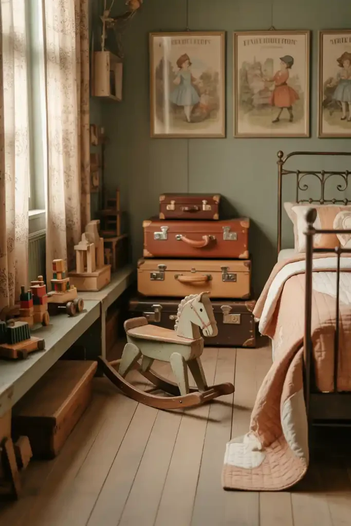 Bring in classic toys, old suitcases for storage, and retro posters. It gives the room a warm, storybook feeling that feels cozy and full of memories.