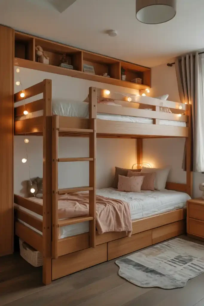 Wooden bunks bring warmth and save precious floor space. Add fairy lights and small shelves on each level so every child gets their own cozy spot.