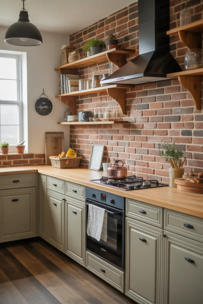 A rustic kitchen backsplash uses exposed brick patterns or reclaimed wood finishes to create that comfortable, lived-in atmosphere many people crave.