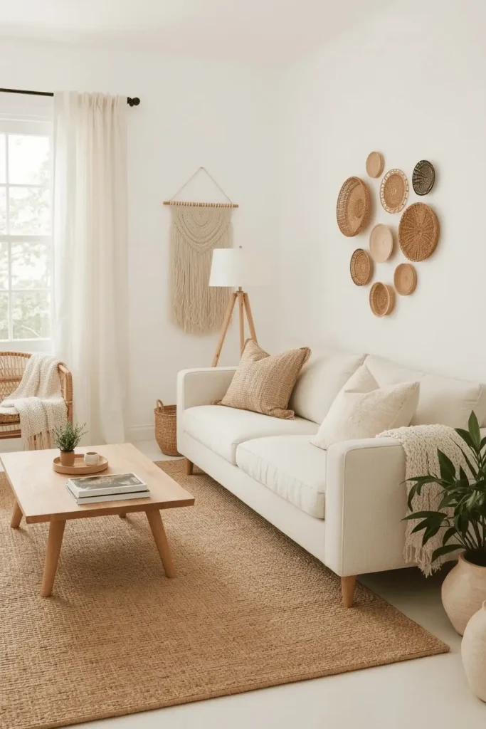 These materials add cozy vibes without adding visual clutter.Try a DIY jute wall hanging or woven basket gallery wall to add personality.