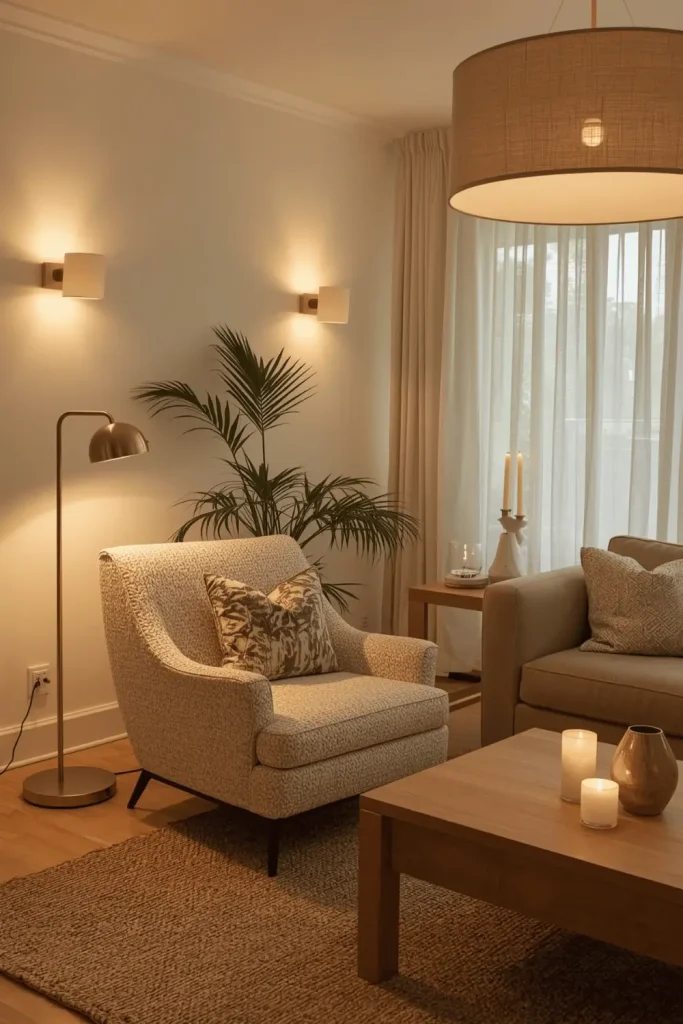 Cream tones pair beautifully with warm, soft lighting. Use warm LED bulbs, brass floor lamps, or wall sconces with dimmers to bring a golden glow.